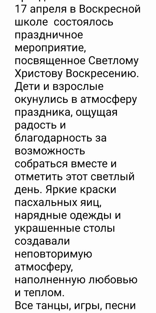 Праздник Праздников в воскресной школе Воскресная школаНовости Апр 20, 2026 14 Празднование Пасхи Христовой в Воскресной школе “Победоносец” – это особенное событие, которое объединяет детей и взрослых вокруг традиций и обычаев этого светлого праздника. Фото, коллаж и информация – Евгения Пехтерева FacebookTwitterGoogle+VKontaktePrintOdnoklassniki Отправить статью как PDF